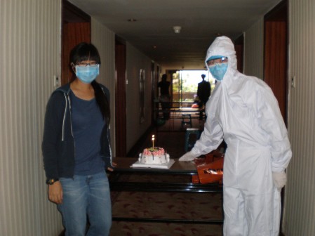 三 在留验区,医疗队员日常的医疗工作就是为留验人员一天测四次体温,询问六大症状,并将采集到的信息报送給有关部门,这看似简单的工作在这种特殊环境中却显得异常艰难,除了要安抚情绪激动的留验人员,使他们配合工作,还要严格按照标准二级防护来穿戴手术衣、防护服、隔离服,戴防护眼镜、N95口罩、双层手套及鞋套来进行操作,为了节省时间和材料,肖瑛护士长和大家一起尽量延长穿隔离衣的时间,原定四小时换一班的计划因为工作繁忙、人员紧张,往往不能按时实现,隔离衣一穿就是十来个小时,期间不能吃饭、喝水、如厕,面罩摘下来时脸上出现红肿、起泡,脱下手套后汗水顺着手指往下滴……但大家为了完成使命,都毫无怨言,尽职尽责的工作。 医疗队在留验区另一项重要工作就是照顾好留验人员的生活起居,由于11名留验人员来自不同国家,生活习惯和对居住、饮食条件的要求大不相同,加之在留验期间心情烦躁,往往提出各种苛刻的要求,张玲霞副院长作为协调组的总指挥,都给予最大程度的满足,尤其是来自日本的留验人员,刚来时提出房间光线不好,医疗队员就请人为他换了大功率的灯泡,提出固定电灯开关不方便,又配备了台灯,提出电视信号不好,想要上网,就配备了笔记本电脑和无线网卡,还要求为他提供热水器、咖啡、吹风机、浴巾、拖鞋等等,张玲霞副院长和郑策主任医师都不厌其烦的一一协调落实,一趟一趟的跑出去为他们购买所需。留验人员的三餐都是由护理人员挨个问过每个人每一餐想吃什么之后,告诉工作人员并详细登记在卡片上,按照要求分别提供。觉得饭菜不合口味,要在外面的饭店订日本料理、牛扒餐,都要通过检疫部门的检疫方能进入留验区,张玲霞副院长还专门挑选能通过检疫的带皮水果提供給留验人员。对于如此繁琐甚至于折磨人的要求,我们的医疗队员都尽量从留验人员的处境和心情考虑,为他们尽可能的多想一些、多做一些,在我院医疗队人员无微不至的照顾下,留验人员的情绪从初来时的暴躁不安逐渐转为平静,和医疗队员的关系也越来越融洽。 5月15日上午,护理人员在送早餐时,一名美籍华裔女士提出,今天是她同在一处留验的女儿王路的20岁生日,能不能为她做一碗长寿面。得知这一信息,郑策主任医师和张玲霞副院长商量后决定,除了长寿面之外,再为这个20岁的花季少女订做一个生日蛋糕,经过征求王路母亲的意见,大家决定事先不告诉她,給她一个惊喜。蛋糕订做回来之后,后勤工作人员杜默闻自告奋勇:“让我把蛋糕送进去,把蜡烛点上,再给她唱首生日歌,让她过个有意义的生日”。为了将蛋糕和长寿面送到王路面前,杜默闻穿上防护服,将蛋糕和长寿面送到走廊,肖瑛护士长将闫璐请出房间,见到生日蛋糕和长寿面的闫璐既惊喜又意外,在一旁的肖护长和小杜轻轻唱起了生日歌,“路路,祝你生日快乐,吹蜡烛许个愿吧!”王路感动的热泪盈眶,连声道谢。虽然环境特殊、条件简陋,但王路却度过了一个难忘的20岁生日。 经过五天的努力奋战,所有的留验人员均无出现异常,四名加拿大籍留观人员于15日下午2:30分安全解离,离开了留验区,16日凌晨1:30分,其余留验人员也顺利解离,三名美籍华人于当日凌晨离开留验区,剩下的四名日本人于16日早上8:30离开留验区,每一批留验人员解除留验时,省卫生厅杨芙英副厅长、市卫生局秦鸿学局长、冯关力院长等有关领导都亲自到场祝贺并欢送,加拿大籍华裔的一对母女在解除留验时对秦局长说:“长时间在国外生活,这次回来才感受到了国人的温暖,感谢大家的关心和照顾!”日本的四名留验人员临走前深深的向我们的医护人员鞠躬,其中一名72岁的老人几乎将头挨到了地上,嘴里不断说着:“太感谢你们了!给你们添麻烦了!”所有解除留验的人临走时都对我们的医疗队员耐心细致、任劳任怨的工作表达了由衷的感谢,而我们的全部15名工作人员,虽然身体疲惫,但圆满的完成了艰巨任务,每个人的脸上都露出了灿烂的笑容……