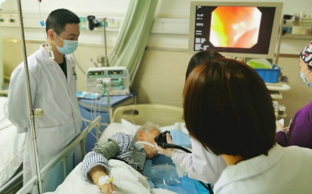 近期,市中心医院消化科收治一名严重消化道出血患者,84岁老年男性,患者病情复杂,合并全身多处疾病,经全院会诊,需行内镜检查,但患者因病情较为复杂,无法进行常规麻醉,且不宜搬动,在疼痛科党彩艳主任医师指导下,王坤主治医师备急救设备,给予床旁清醒镇痛,密切监护病人生命体征,经过消化科张欣主任医生精准操作,患者全程清醒无不适,配合度好,患者及家属对无痛舒适化的诊疗过程非常满意。