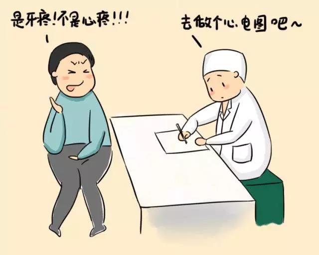 老王最近经常牙痛,因为害怕看牙所以一直忍着,反正以前也经常牙痛,吃点药就挺过去了。可是这次不太一样,吃了消炎药和止痛药好像没啥作用,而且疼痛每次持续三五分钟,之后牙就像正常了一样,吃饭时也不疼。最后无奈之下只好硬着头皮来到口腔科看牙,结果医生检查了一通后居然让他去心内科看看。老王心里想,我来看牙你却让我去心内科,你是把我当皮球踢吗?
