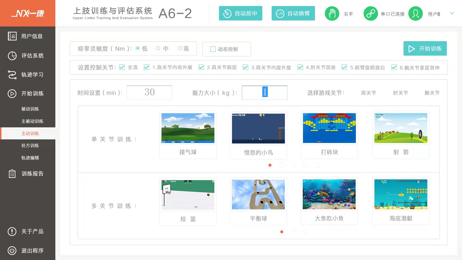 除此之外还具有主动训练模式、处方训练模式、轨迹编辑模式,多种训练模式满足不同患者的训练需求,多款情景互动式的游戏还包括了梳头、进食等日常生活活动能力的训练,为了可以让患者康复后最大程度的回归社会回归生活。