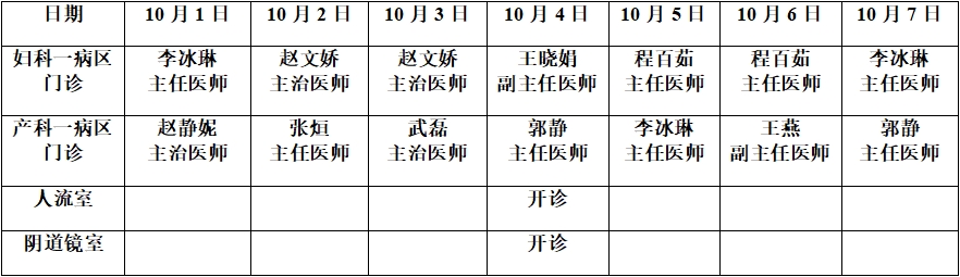 国庆节假期妇产科门诊安排表