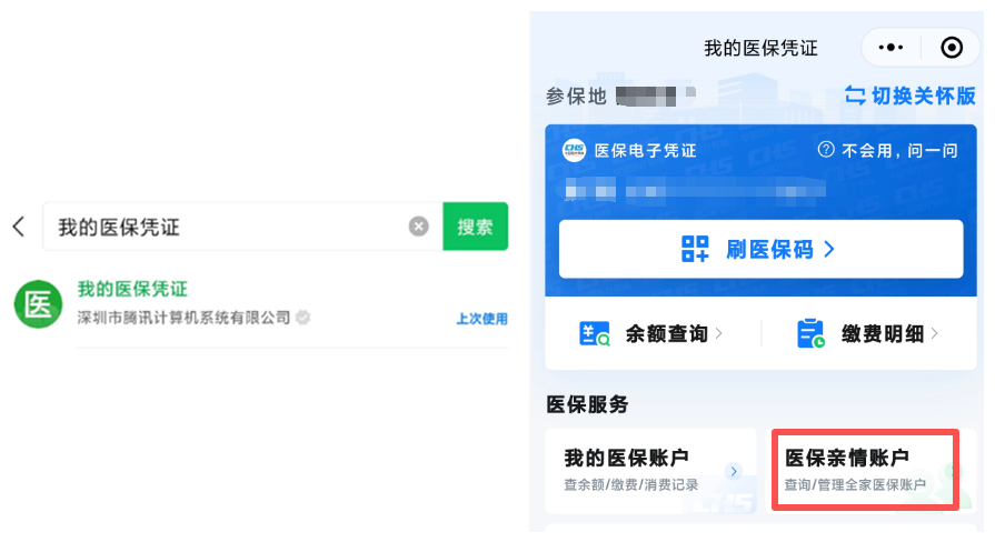 在微信小程序搜索“我的医保凭证”→进入 “医保服务” 页面→找到 “医保亲情账户” 入口;