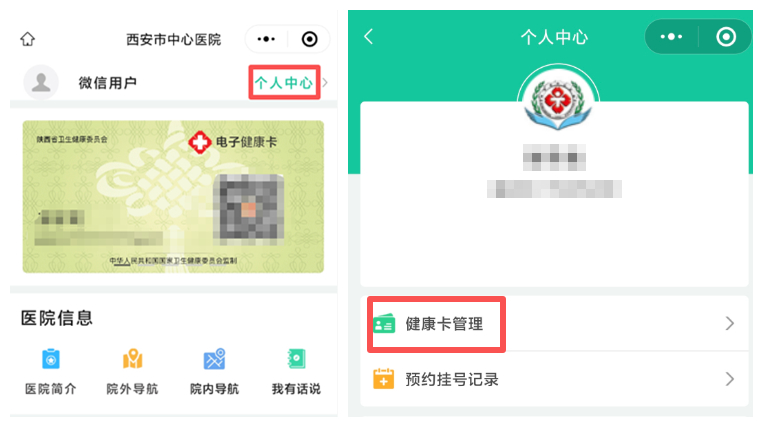 在微信小程序搜索“西安市中心医院小程序”进入个人中心→健康卡管理→添加健康卡。