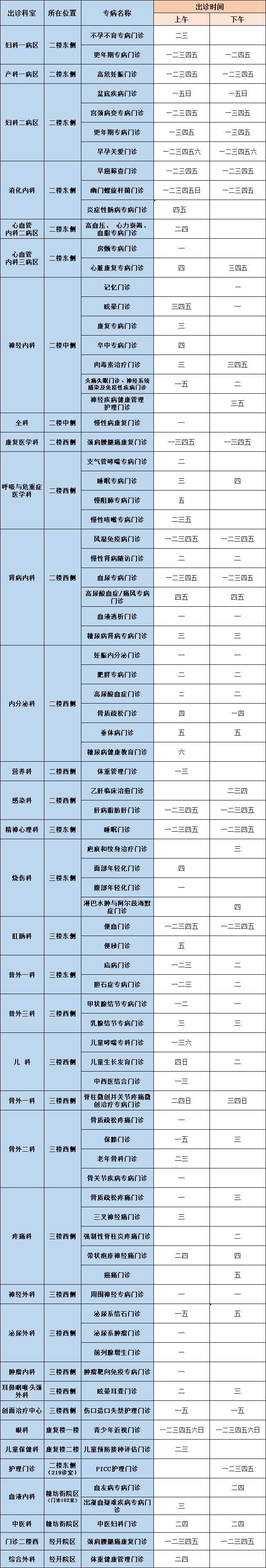 专病门诊出诊时间表