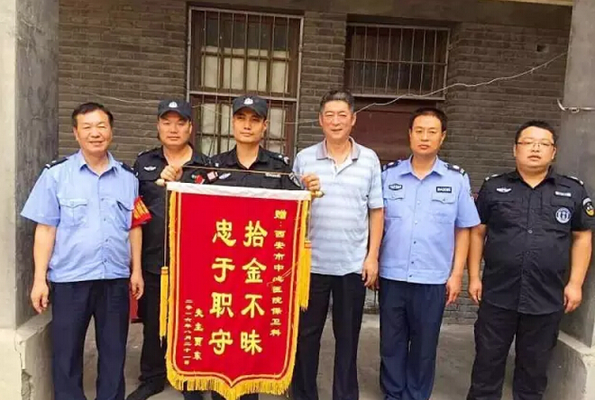 8月21日上午10点,保安叶飞在市中心医院门诊大厅执勤时捡到一个钱包,保卫科在多方协助下找到失主,并积极联系失主、核实失主身份后将钱包归还。失主于8月22日上午来院向保卫科赠与锦旗一面以示感谢。