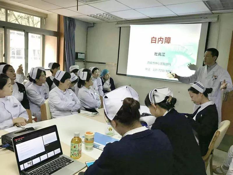 杜兆江主任亲自为大家讲解了《白内障》的疾病知识。他生动、精练的介绍,使与会的医务人员在轻松愉悦的氛围中全面了解了白内障的病理生理机制和目前治疗现状,为一次高质量的护理查房奠定了基础。全体护士长认真聆听了杜主任的讲课,并对所查患者的病情评估、护理查体结果、责任护士提出的护理诊断、制定落实的护理措施进行细致评价与热烈讨论。之后,眼科护长还就2017年5月以来开展的“人文护理”情况进行了简单的汇报,对本科室的“人文护理”举措进行展示,拓宽了全院各护理单元深入开展人文护理的工作思路。
