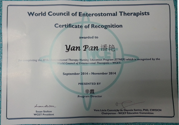 业文凭,成为我院首个,也是西安市级医院首个国际造口、伤口、失禁治疗师(ET)。