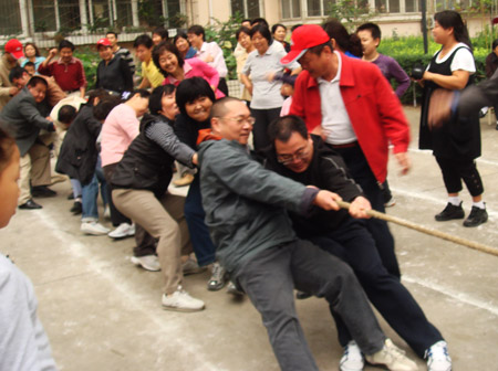 为庆祝中华人民共和国建国60周年和喜迎“中秋”佳节,我院于十月七日在二府庄小区成功举办了“西安市中心医院二府庄小区第二届职工家属趣味运动会”。 上午九时许,运动会在崔主任主持下召开。参加开幕式的有我院领导冯关力、薛军、刘遵礼和三产办副主任张立新同志,以及区、街道办相关负责人。冯院长对我院二府庄小区筹办这次职工家属趣味运动会给予了充分的肯定:三产办暨小区物业办通过举办多种形式的活动,不仅活跃了小区职工家属的文化生活,使邻里间建立起了友谊与和谐的桥梁;而且还提升了我院小区职工家属的全民健身意识,增强了物主与物业办的相互信任。 这次运动会设有个人跳绳、集体跳绳、自行车慢骑、托球跑、乒乓球及拔河比赛等项目。运动场上参赛人员个个摩拳擦掌,你追我赶,奋勇拼搏;围观群众喜笑颜开,呐喊助威。大家兴奋地说:这次趣味运动会不仅丰富了我们的业余文化生活,而且还对构建和谐社会,增强社会主义精神文明建设起到了积极的作用。