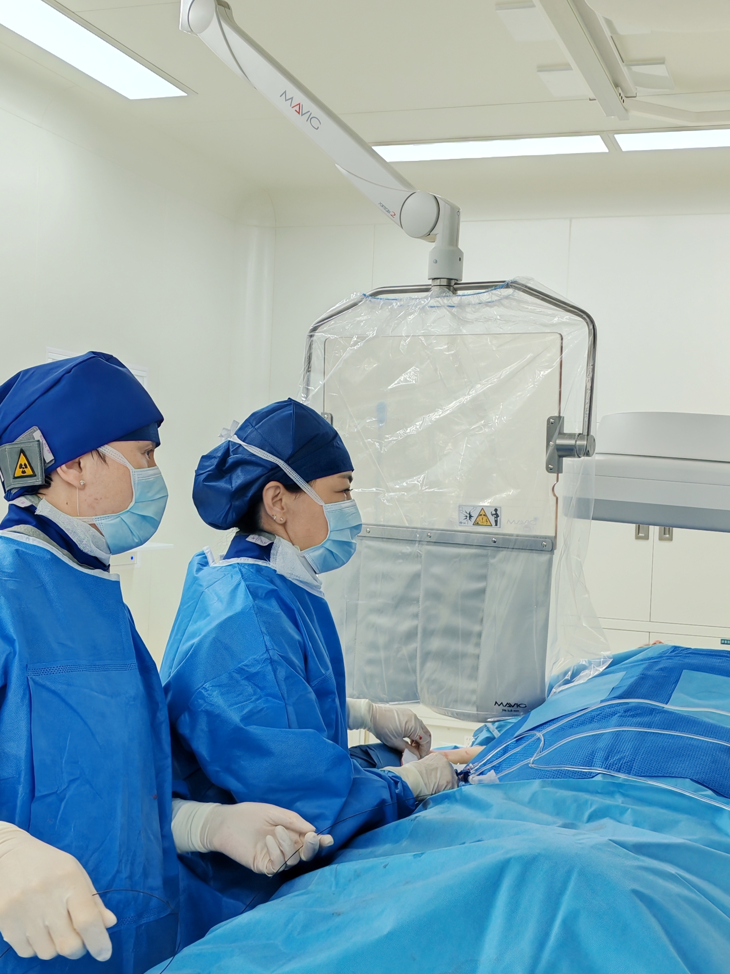 2025年4月21日,西安市中心医院经开院区介入导管室内,神经内科介入团队在雷辉主任医师的带领下和导管室的大力支持下,顺利完成了该院区首例经桡动脉入路全脑血管造影术。此次手术由雷辉主任医师与薛秀云副主任医师共同操作完成,标志着经开院区在神经介入诊疗技术上迈出了新的一步,从传统手术后需要卧床24小时的股动脉入路手术到术后即刻下地的桡动脉入路脑血管造影术,实现了舒适化医疗从主院区向经开院区的“北跨”。