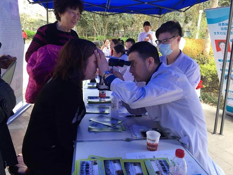2018年3月15日,正值春暖花开,也是第十一个世界青光眼周。沐浴着阳春三月的阳光,舍弃繁忙工作中难得的午休时间,我院眼科杨格强副主任医师带领霍敏主治医师及实习医师刘玉萍、诸磊、郭佳恒、张娟娟,联合紧密医联体莲湖区北关社区卫生服务中心医务人员,自带视力表、裂隙灯、眼底镜等检查设备,进入龙首村宫园壹号小区,为小区的居民进行青光眼科普和免费义诊,让小区居民享受到足不出户、方便快捷的三甲医院眼科医疗服务。