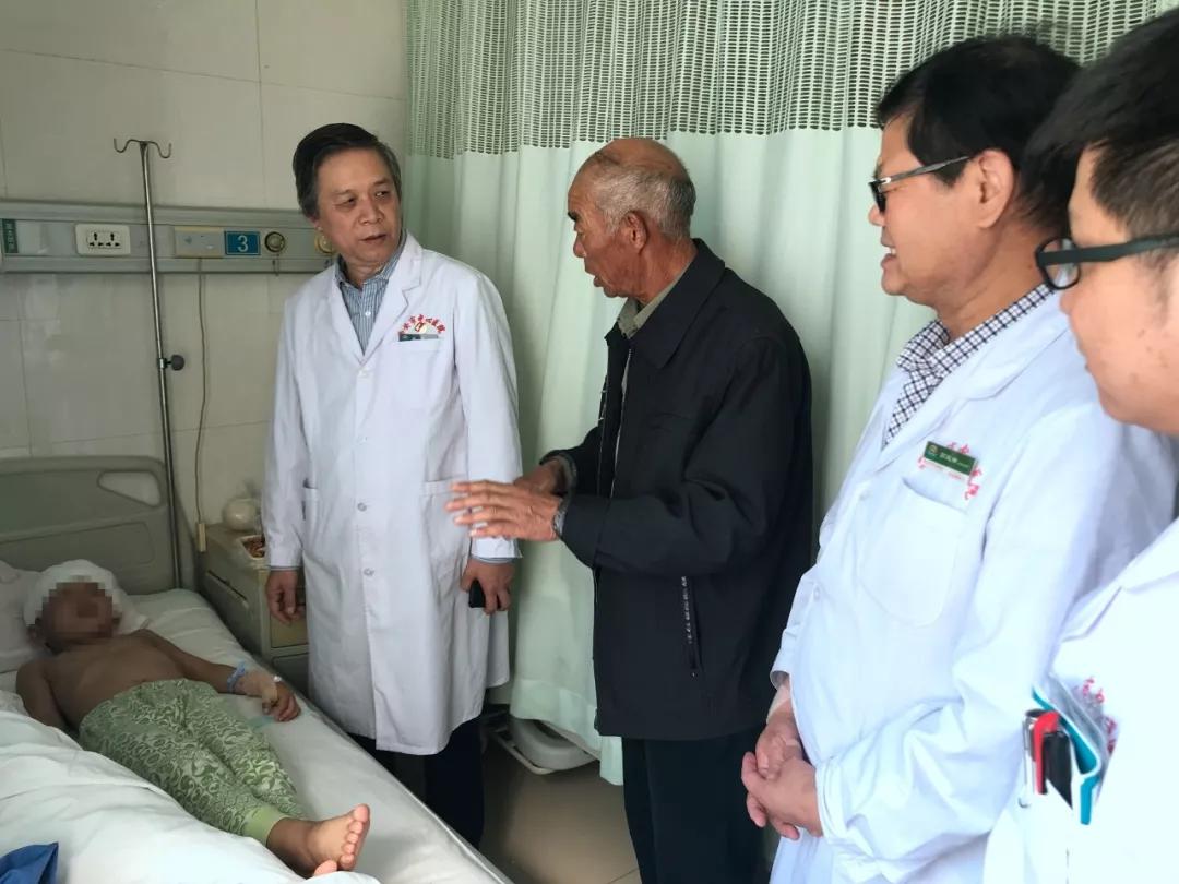 这名来自蒲城的7岁小朋友余某,在放学后到田地里找劳作的爷爷奶奶,不慎被自家牧羊的大狗扑倒撕咬,爷爷听到孩子哭喊后和家人赶来将狗撵走,但是孩子头顶部大面积头皮撕脱,同时头部布满大狗撕咬的牙印。在当地医院对伤口冲洗后,经过四小时车程,赶到了西安市中心医院,经过急诊和烧伤整形科医生通力合作,在凌晨给孩子做了清创和狂犬病免疫球蛋白注射,目前小朋友病情平稳,已度过危险期。市中心医院院长虎威得到消息后第一时间去病房探望了小患者,询问情况后安排科室一定全力救治,并对患儿家属进行了慰问。此病例再次得到了省市各大媒体的关注。