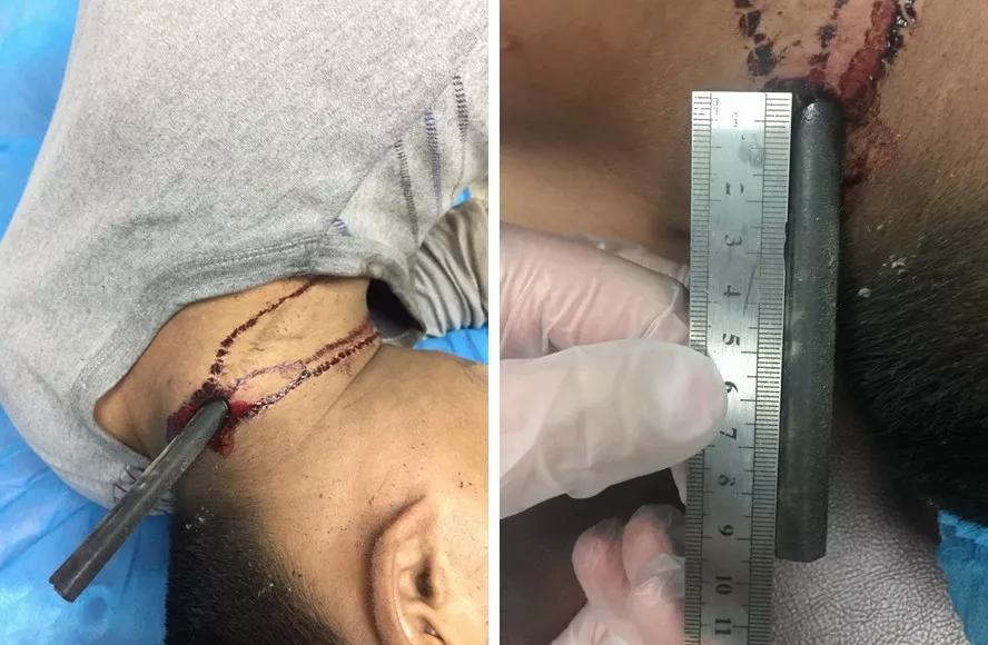 9月4日下午4时,29岁小伙小张蹲地干活时,左侧后方配电箱突然倒塌,致一截长约19cm钢缆从左侧颈部插入体内,伤后小张趴在地上不能动弹。病情凶险,家人急忙将小张送往西安市中心医院急诊科。急诊科郭敏峰主治医师紧急查看病人,见钢缆从小张左侧颈项部插入,体外残留约9.5cm。